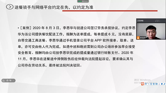 8月21日,宣讲团成员经济与法律学院研究生李泊洋通过线上形式为鞍山青年学生、小微企业部分员工讲解《中华人民共和国劳动法》。李泊洋宣讲团队认真筹备,集体研讨,精心制作课件,通过生动鲜活的现实案例、深入浅出的语言表达为大家普及了用工关系的认定、民法基本原则在劳动用工中的适用、工伤认定等《劳动法》法律常识,引导青年学子和小微企业员工常态学法,自觉守法,运用法律武器维护自身权益。