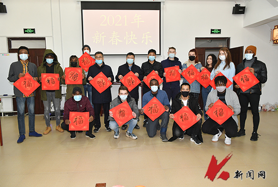 在国际教育学院,伴随着欢快喜庆的春节序曲,来自不同国家的留学生们泼墨挥毫,他们手法娴熟、有模有样地书写着“福”字,体会着中国法传统文化的美感与意境,以及其中所蕴含的悠长而美好的祝福。据介绍,目前在校留学生有45人,校领导详细询问了他们的生活和学习情况。校长张志强代表全校师生向各位留学生表示亲切慰问,他说,过去的一年很不平凡,新冠疫情席卷全球,在这样的大背景下,我们广大留学生们克服了重重困难,积极支持和配合学校的各项安排,在此对大家表示衷心的感谢。春节是中国最重要的节日, “过年”是最大的文化,留学生们响应政府“就地过年”的倡议,既是把自己融入了中国的建设和发展之中,也是体验中国文化的最好时机,希望大家能够度过一个难忘又祥和的中国年。同时他也提醒广大留学生要遵守学校相关防疫要求,做好个人防护工作。