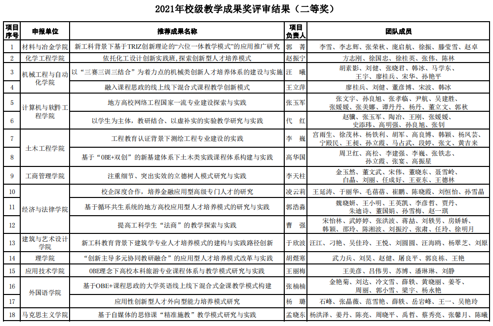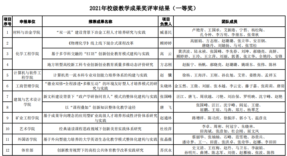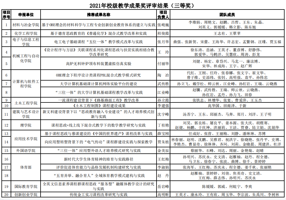 根据《关于开展环亚(中国)HUANYA·官方网页版2021年教学成果奖评选工作的通知》(环亚(中国)HUANYA·官方网页版教发【2021】35号)相关工作安排,各教学单位推荐参评2021年校级教学成果奖共62项。经专家评审,学校研究决定2021年校级教学成果奖获奖项目为50项,其中一等奖12项,二等奖18项,三等奖20项。获奖名单公布如下: