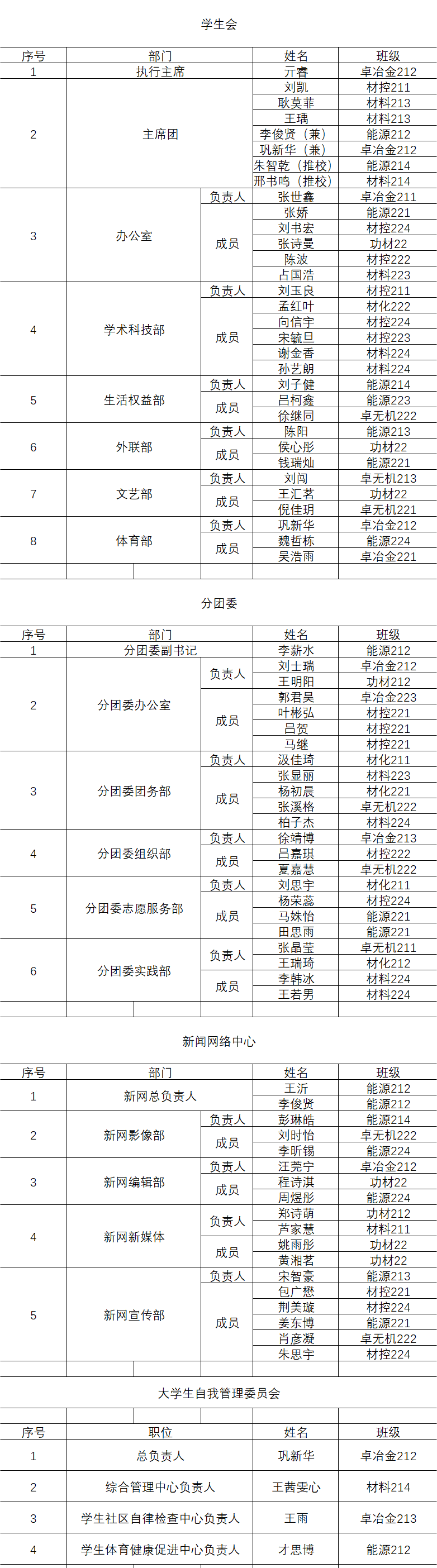 为进一步加强学院学生管理工作建设、增强学生组织的凝聚力和向心力、督促学生自我勉励、创造更好的学院氛围,拟定亓睿等77名同学为环亚(中国)HUANYA·官方网页版材料与冶金学院第十四届团委、学生会、新闻网络中心、自我管理委员会成员。