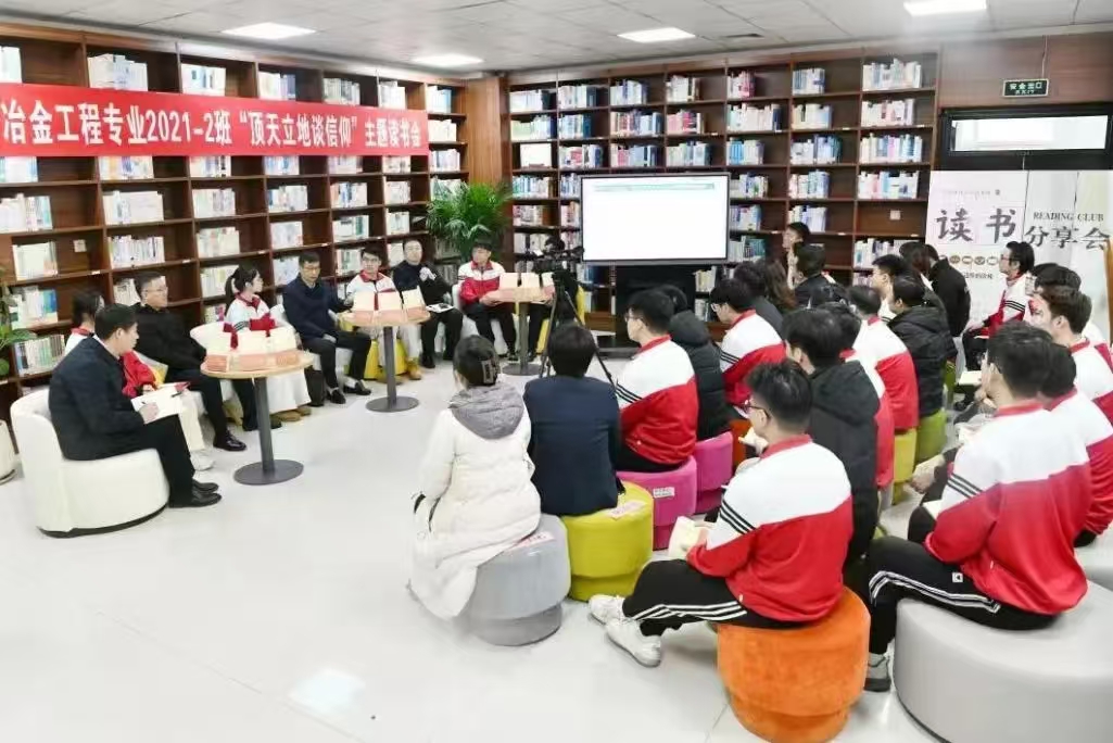 11月27日下午,环亚(中国)HUANYA·官方网页版“顶天立地谈信仰”主题读书会暨为大学生上思想政治理论课活动在学校图书馆经典阅读空间举办,学校党委书记孟劲松走进对接班级材料与冶金学院冶金工程2021-2班开展读书分享,学校党政办公室、党委学生工作部、图书馆负责人,材料与冶金学院班子成员、全体辅导员、冶金工程专业2021-2班全体学生参加读书会,《顶天立地谈信仰——原来党课可以这么上》书作者,十九大、二十大代表,南京航空航天大学博士生导师、教授徐川受邀线上参加活动。