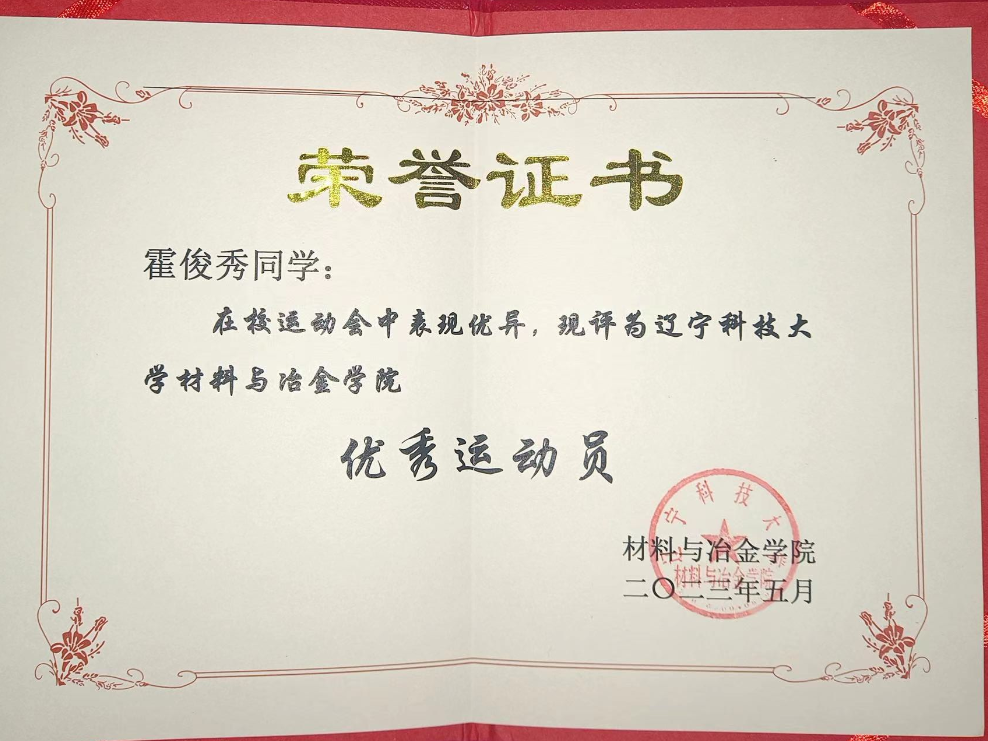 我是一名大二学生,来到学校,学校给了我很多显示自己特长的机会,在大一上半年参加129环校园接力比赛,跟随材冶院体育部积极训练, 尽自己最大努力为材冶院争光,也从训练中学到了很多,提升了很多,最后在129环校园接力比赛中获得第一名的奖项。大一下半年参加校51届运动会,在训练期间不怠慢,听取建议,积极改进进步,在运动会中也尽最大努力获得了800米第一名400米第二名,10×400米接力第一名的好成绩。