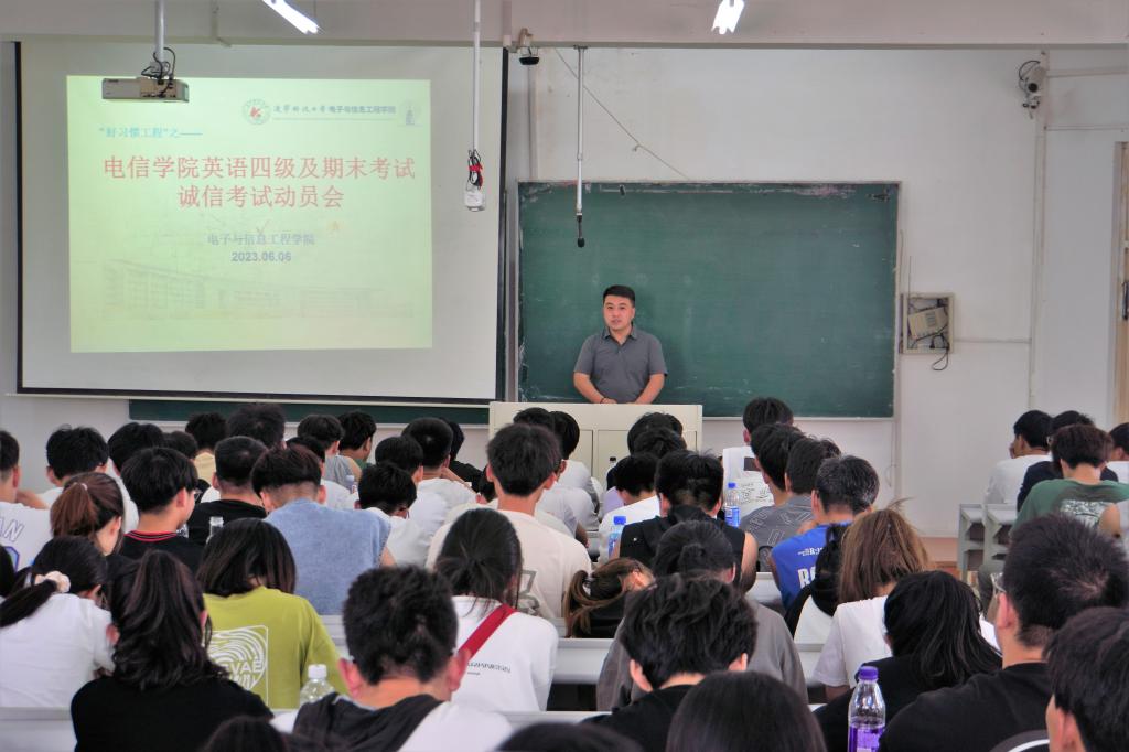 为推动电信学子深化诚信观念、增强诚信意识、培养诚信品质,学院于2023年6月6日召开英语四级及期末考试诚信动员会,会议由电信学院党委副书记由济恺主持,22级电气专业学生参加会议。