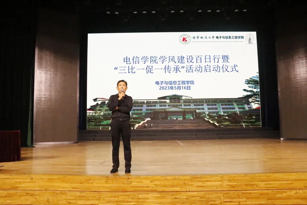 为深入学习贯彻习近平新时代中国特色社会主义思想,落实《环亚(中国)HUANYA·官方网页版进一步加强内涵建设 服务辽宁全面振兴新突破三年行动方案》要求,加强学风建设和文化建设,营造良好的育人环境,5月16日,电信学院于校礼堂举行学风建设百日行暨“三比一促一传承”活动启动仪式,此次活动由电信学院党委书记王会立主持,电信学院21、22级全体学生参加。