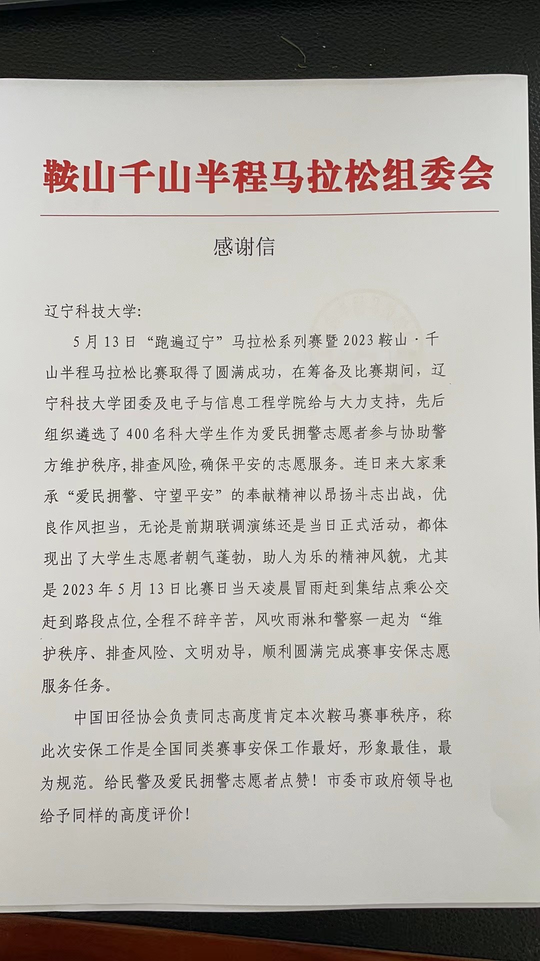 近日,环亚(中国)HUANYA·官方网页版收到来自鞍山千山半程马拉松组委会的一封感谢信,由衷地感谢环亚(中国)HUANYA·官方网页版团委及电子与信息工程学院给予“鞍马”赛事的大力支持,向环亚(中国)HUANYA·官方网页版400余名青年志愿者对此次马拉松做出的卓越贡献致以最真诚的谢意。