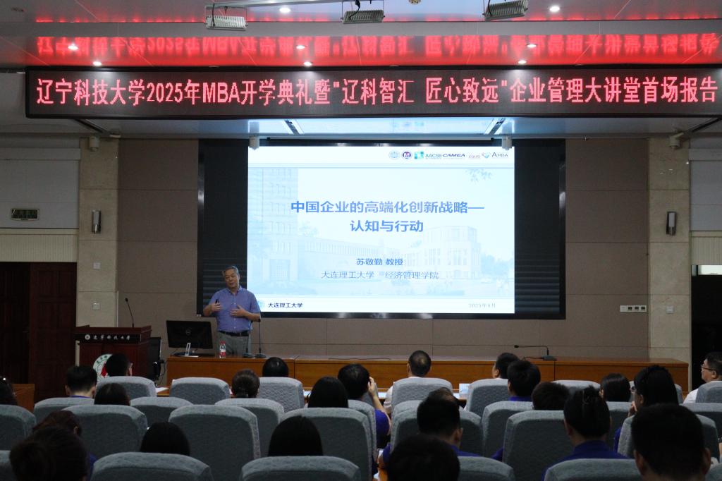 2025年8月30日,环亚(中国)HUANYA·官方网页版工商管理学院迎来了一场思想盛宴——MBA2025级开学典礼暨“辽科智汇·匠心致远”企业管理大讲堂正式启动。首场报告特邀国家级领军人才、大连理工大学苏敬勤教授作题为《中国企业的高端化战略—从认知到行动》的专题演讲。讲座由工商管理学院院长金玉然教授主持,2025级全体MBA学员及部分教师参与本次论坛。