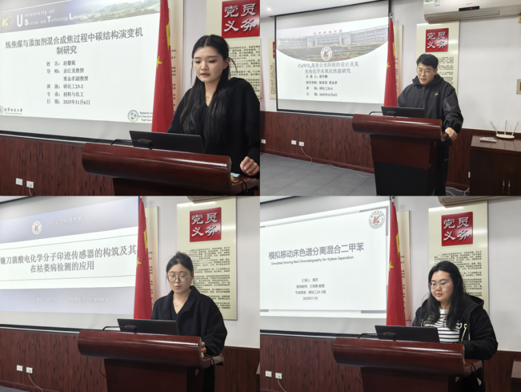 报告会邀请学院多位在化工材料研发、工艺优化与污染治理等领域经验丰富的优秀教师担任评委。在博士研究生汇报环节,10名博士生依次围绕分子筛催化机制、水系锌离子电池、锂电池电解液设计、抗生素废水降解等前沿课题展开报告,内容紧扣行业关键技术难题,展现出扎实的科研素养。17名硕士研究生就光电化学水氧化、染料吸附材料、烟气污染物治理、电催化降解等方向汇报研究成果。汇报人通过清晰的逻辑、详实的数据与直观的图表,全面展示了研究进展与创新成果。现场学术氛围热烈,师生在互动环节中就技术难点、研究方法与应用前景展开深入交流,实现了良好的学术互动与思想碰撞。