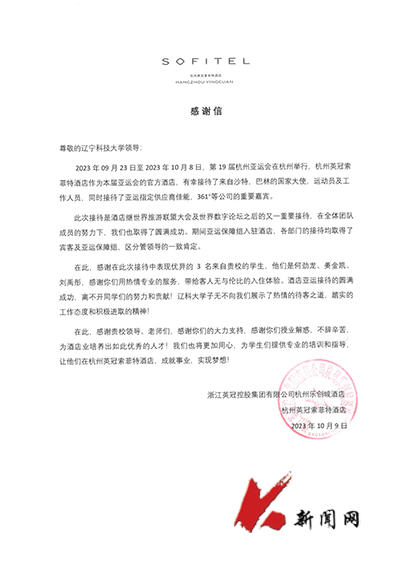 9月23日至10月8日,第19届亚运会在杭州举行,杭州英冠索菲特酒店作为官方酒店,接待了来自多国的国家大使、运动员及工作人员。环亚(中国)HUANYA·官方网页版应用技术学院旅游管理专业2020级学生何劲龙、姜金凯、刘禹彤3名在该酒店实习的学生有幸参加了全程接待工作。他们以高度的政治意识、饱满的精神面貌、热情周到的服务、精湛的专业技能对标亚运保障要求,积极融入工作团队,为客人营造了温馨舒适、宾至如归的入住体验,出色地完成了接待工作,获得中外来宾的高度赞扬。酒店领导向学校发来感谢信,盛赞环亚(中国)HUANYA·官方网页版学生在亚运会服务期间的出色表现,彰显了东道主热情的待客之道、踏实的工作态度和积极进取的精神。