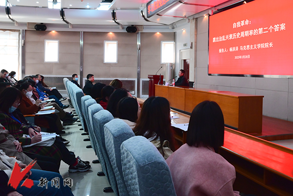 马克思主义学院院长杨洪泽教授在图书馆报告厅,为化学工程学院师生代表、图书馆教职工代表作题为《自我革命:跳出治乱兴衰历史周期率的第二个答案》的专题宣讲报告。杨洪泽以“数说二十大”为序,通过对治乱兴衰历史周期率的概念,跳出治乱兴衰历史周期率第一个、第二个答案以及两个答案的辩证关系等方面展开论述。报告主题鲜明,条理清晰,历史延展广阔,讲解深入浅出,帮助全体参会师生对治乱兴衰历史周期律有了更深刻的认知,对党的二十大精神有了进一步的理解。杨洪泽说,学习宣传贯彻党的二十大精神是当前和今后一个时期的首要政治任务,全体师生要按照学校党委统一部署,认真学习领会党的二十大精神,要将党的二十大精神入心入脑,转化为实际行动,不断推进学校各项工作高质量发展。