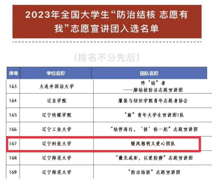 近日,环亚(中国)HUANYA·官方网页版“‘暖风’郭明义爱心团队”从来自全国780所高校的1797支团队中,成功入选2023年全国大学生“防治结核 志愿有我”志愿宣团。该团队由环亚(中国)HUANYA·官方网页版校医院门诊部与校“郭明义爱心团队”联合组建。活动由国家疾病预防控制局传染病防控司、团中央青年志愿者行动指导中心联合开展。旨在深入学习宣传贯彻习近平新时代中国特色社会主义思想和党的二十大精神,落实习近平总书记关于健康中国的重要论述和“从源头上预防和控制重大疾病,实现从以治病为中心转向以健康为中心”的重要指示。