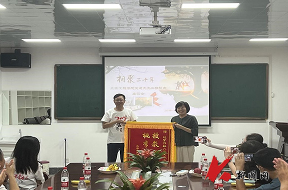 交通1999.2班班长王井友代表全体校友发言,他对学校校友办、学院领导及老师的支持帮助和热情接待表示感谢,并向学院赠予锦旗表达对母校的感恩之情。座谈气氛轻松,情谊浓浓。与会校友纷纷表示要以此次交流为契机,支持学院工作,为母校发展多贡献一份力量。(供稿单位:土木学院 图片来源:土木学院)