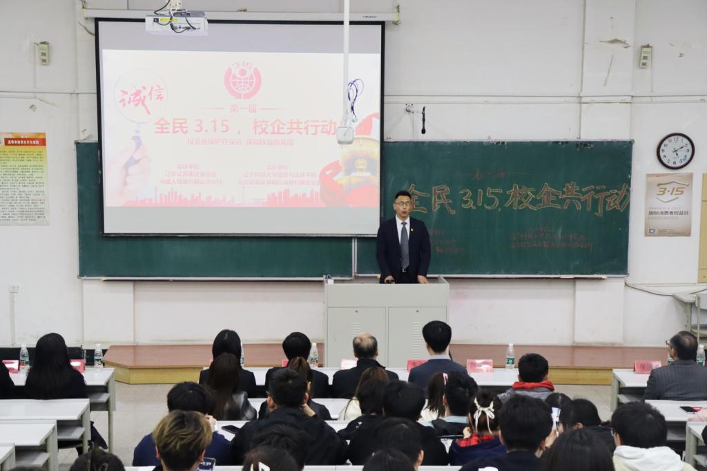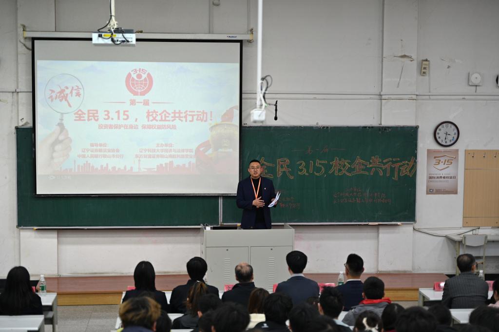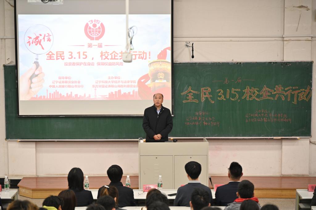 3月14日,经法学院携手东方财富证券鞍山营业部在博学楼A301开展第一届“全民3.15,校企共行动”主题活动。东方财富证券鞍山营业部及中国人民银行鞍山分行、辽宁证监局、辽宁证券期货业协会以及易方达基金公司代表一行10余人、经法学院党政领导及辅导员5人出席活动,学院近300名学生参加了本次活动。