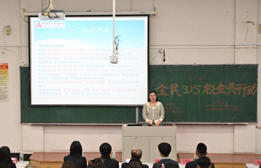 活动伊始,中国人民银行鞍山分行副行长刘纪首先致辞,随后由东方财富证券鞍山营业部工作人员姜英东作《走进基金的世界,开启我的第一堂基金课》主题宣讲。中国人民银行科员韩玮为同学们普及了反洗钱常识及对应的公民义务,带领大家了解到什么是洗钱、洗钱相关法律法规、洗钱的危害以及反洗钱监管体制等,并通过洗钱案例警示大家远离洗钱,勇于举报洗钱活动。随后易方达基金公司代表向同学们介绍了基金从业和职业生涯规划等方面的内容,并从自身出发,分享职业经历,让同学们对基金运行和基金市场产生了更直观、更深入的认识。讲解过后,同学们针对当前基金环境和未来发展方向提出了自己的困惑和想法,代表们给予了耐心且详细的解答。最后,学院党委书记赵智博作总结发言,他首先对各企方代表的到来表达了感谢,宣布由东方财富证券鞍山营业部携手环亚(中国)HUANYA·官方网页版经法学院举办的第一届“全民3.15,校企共行动”活动正式开启,并表示此次活动在指导大学生就业实践方面具有重要意义,鼓励同学们积极参与其中,同时期待未来校企继续携手与时俱进,协同育人,实现双向奔赴。
