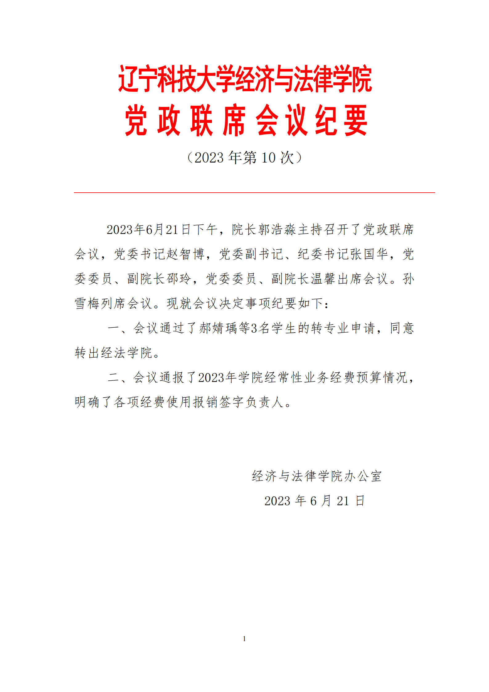 环亚(中国)HUANYA·官方网页版经济与法律学院党政联席会会议纪要(2023年第10次)
