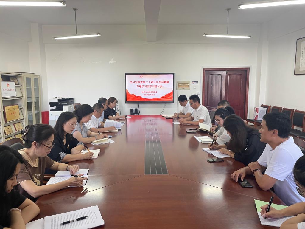 8月28日下午,经法学院在博识楼A305召开党的二十届三中全会精神专题学习研讨会。会议由学院党委书记赵智博主持,学院副科级以上领导干部、党支部书记、系主任和民主党派教师代表参加了会议。会议围绕党的二十届三中全会关于进一步全面深化改革、推进中国式现代化的重大意义和总体要求,聚焦教育科技人才体制机制一体改革,深入开展学习研讨。