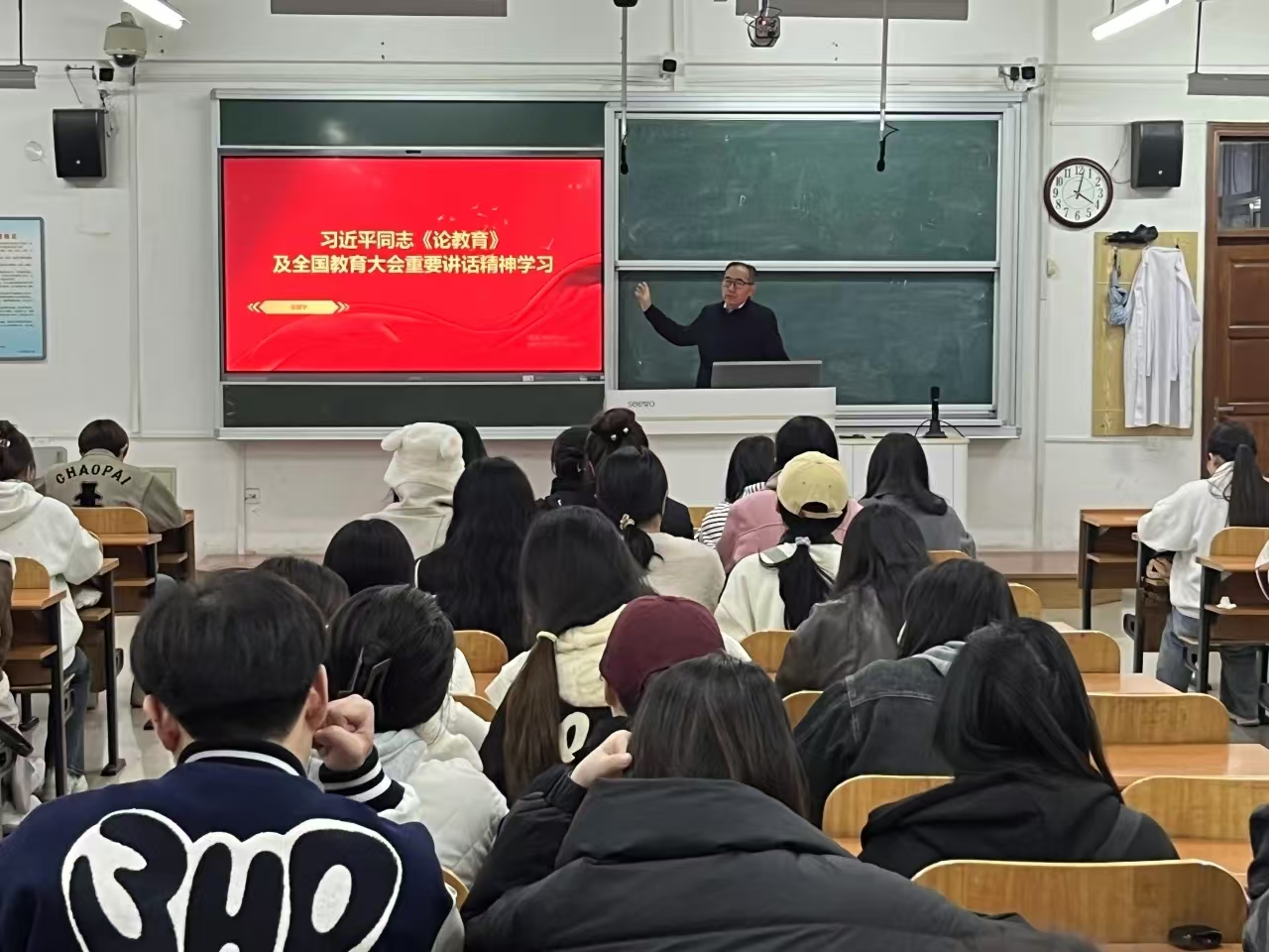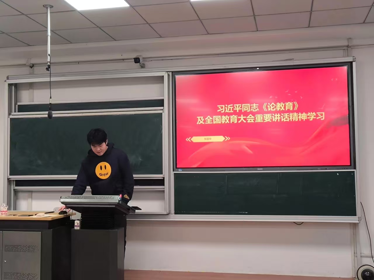 辅导员以“学习习近平同志《论教育》和习近平总书记在全国教育大会上的重要讲话精神”为主题,深入讲解教育的政治性、人民性和战略性,教育引导学生全面领会教育强国的科学内涵。辅导员表示,新时代青年要把个人理想追求融入党和国家事业当中,为推进强国建设、民族复兴贡献自己的力量。