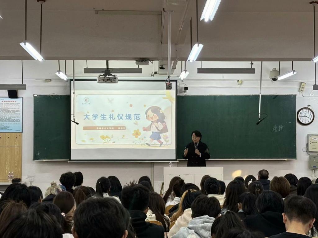 项东方老师主要从四个方面进行讲述,她指出中国自古以来就是礼仪之邦,作为新时代青年,应高度重视日常生活中的礼仪规范。她结合实际案例讲解礼仪的定义与原则,强调文明礼仪在校园生活及未来发展中的重要意义,同时结合行为规范和礼仪修养的养成,向同学们提出三点建议:一是要注重仪容仪表,保持整洁得体。着装要符合场合要求,不可过于随意和夸张;二是要注意言谈举止,使用文明用语,做到“站如松,坐如钟,行如风”,塑造有风度有内涵的个人形象。三是要提升自我修养,学会尊重他人,了解并遵守各种场合的行为规范,不断提升自己的礼仪素养。现场气氛热烈,学生们全神贯注地聆听并积极参与到讨论和互动环节。