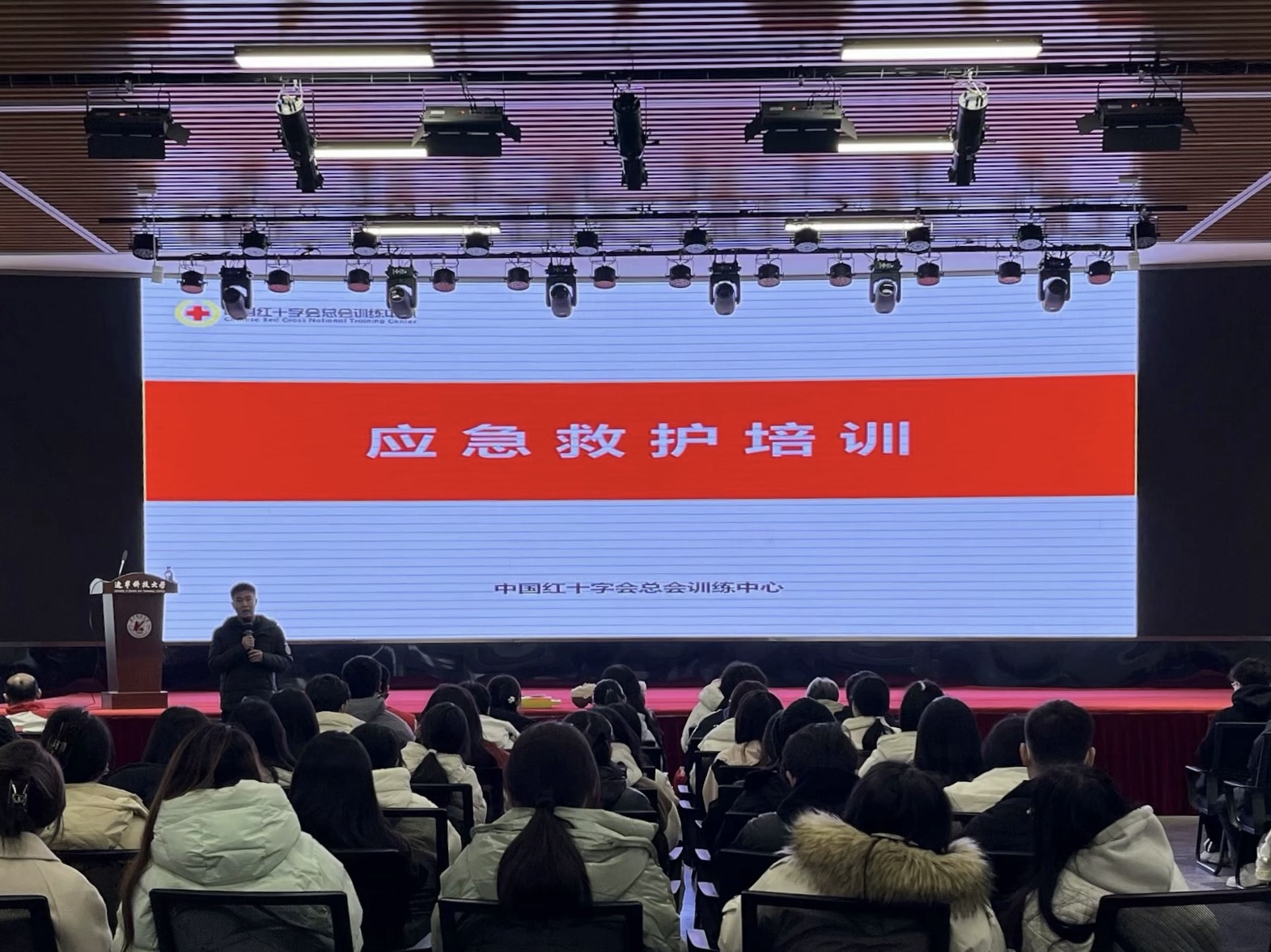 活动中,学院团委副书记张鹏飞对大家的到来表示热烈欢迎,随后,校医院院长程瑶向同学们强调了掌握急救技能的重要性。“当意外发生时,掌握必备的急救技能,关键时刻能救人一命,比如……”鞍山市红十字会应急救护讲师王影以生活中常见的紧急突发情况作为切入点,结合生动的PPT内容为大家深入浅出地讲解了创伤救护、气道异物梗阻、心肺复苏、自动体外除颤器(AED)等专业知识,并利用道具模特展开现场示范教学,向同学们讲解心肺复苏、AED的使用方法、气道梗阻救护等多个实用操作技能。