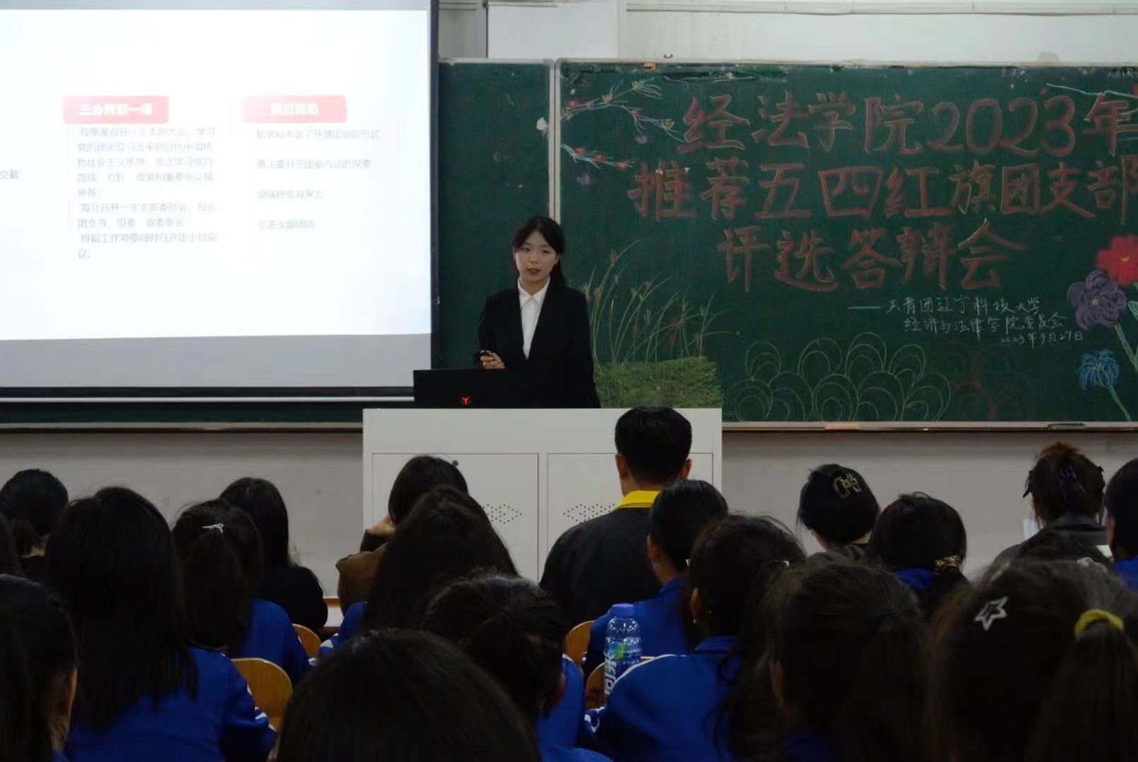 经过前期申报与民主评议等环节,共有5个团支部参与本次答辩会。各团支部书记将文字与图片相结合,从支部人员组成、“青年大学习”网上主题团课学习、主题团日活动以及班级参加志愿公益活动等方面全面阐述了团支部在学习成果、组织建设、精神面貌以及综合素质能力等方面取得的成就。最后,学院团委副书记张鹏飞对此次评选答辩会进行了总结并提出建议,他充分肯定了各团支部在工作上取得的优秀成绩,再次强调了各团支部要切实加强基层组织建设,不断提升团支部的引领力,并继续构建班团一体化,提升团支部对青年学子的吸引力。同时,各团支部也要创新开展主题团日活动,努力把团支部建设好,充分发挥团支部的示范引领作用,更好地建设班级,展现经法风采。最后,法学22-2和金融22-1团支部荣获本次五四红旗团支部。
