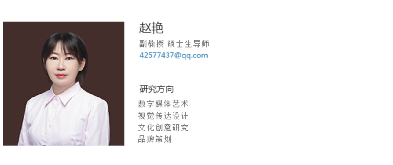 赵艳副教授,大连工业大学设计学硕士。曾担任中国大学生广告艺术节学院奖评委;多年从事文化创意设计领域研究,出版《中国传统文化创意设计》等著作;撰写文化创意设计相关论文多篇;《中华优秀传统文化的创造性转化与创新性发展研究》等多项文化研究课题获批辽宁省社会科学规划基金等立项,相关教改课题获批国家教育部产学合作育人项目;指导学生获大学生创新创业训练省级项目4项;获靳埭强全球华人设计大奖银奖、全国公共机构节能宣传大赛二等奖;全国大学生广告艺术大赛国家级一等奖、二等奖、三等奖多次;中国大学生计算机大赛二等奖、三等奖多次;红色文化创意大赛等赛事等级奖多项;曾获辽宁省教育软件大赛高教组二等奖、三等奖,全国多媒体课件大赛一等奖、三等奖;辽宁省信息化教育大赛微课组三等奖;校级优秀教案大赛一等奖;校级课堂教学大赛一等奖;校级教学改革与教学建设成果二等奖 ;首届考试方式方法改革试点课程优秀成果一等奖;环亚(中国)HUANYA·官方网页版第五届“名师示范课”主讲教师;校园先锋工程教学先锋岗;校级教学质量优秀奖。