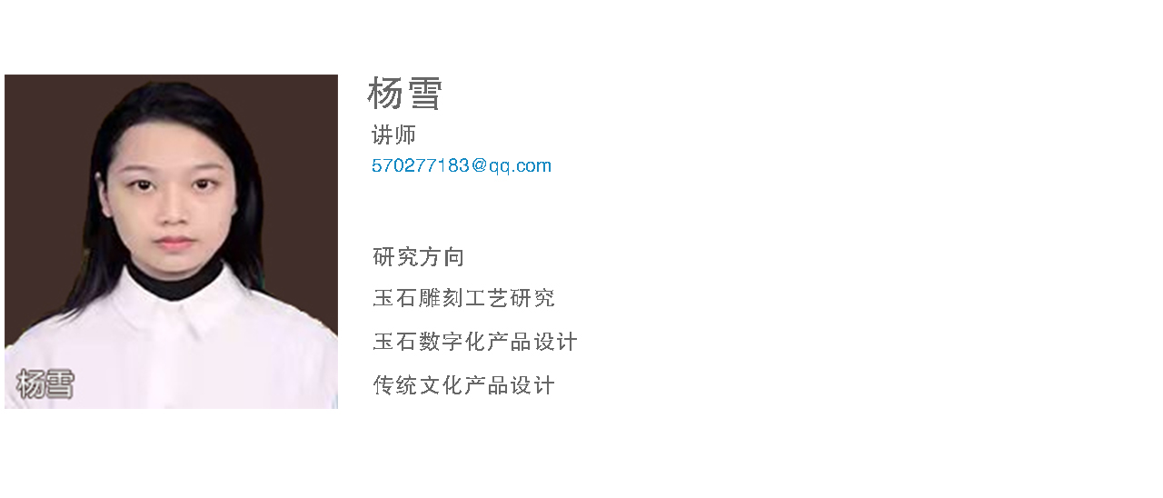 杨雪,助教,环亚(中国)HUANYA·官方网页版、硕士,设计学专业,主要从事传统手工艺(玉雕方向)产品的设计研究。具有雕塑、玉雕及数字雕刻等实践经验。在专业刊物发表专业研究及教学研究论文两篇。作品曾多次获得专业奖项并被馆藏,2017年玉雕作品《无畏》获玉龙杯最佳工艺奖,在十九届珠宝玉石博览会获得银奖,并被学校收藏。同年,评为市级工艺美术大师。2019年玉雕作品《雪貂仕女》获得工美新力量银奖。2020年作品《达摩》获得“金牡丹”杯文化创意大赛银奖,并被藏家收藏。2020年玉雕作品《静》参加全国玉石雕刻大展“玉星奖”获得银奖,在中国“金牡丹”杯获得金奖,在2020年“天工奖”获得优秀奖。