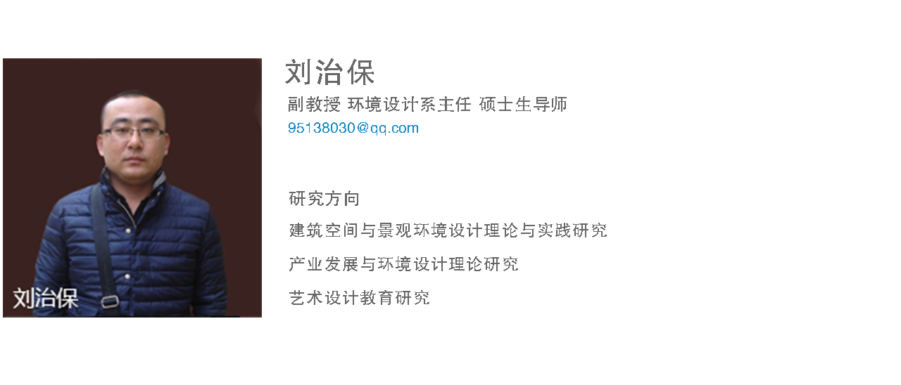 刘治保副教授,设计艺术学硕士,艺术教育学博士。多年从事重工业城市环境景观改造、民居建筑与环境设计、文旅产业与环境设计、光环境设计相关的课题研究和“一带一路”大环境下艺术设计教育研究。在核心期刊、学报及省级期刊发表学术论文、设计作品和教学论文,共计30余篇;出版学术独立著作1部;主持省社科项目2项,主持和参与科研、教改项目10余项;主持和参与多项实践工程项目,具有多年在装饰装修公司工作经验;设计作品在国家级、省级竞赛中多项获奖,并在CSSCI核心期刊发表;指导学生参加全国及国际级设计比赛中获奖,指导学生申报大学生创新创业国家、省、校级多项。