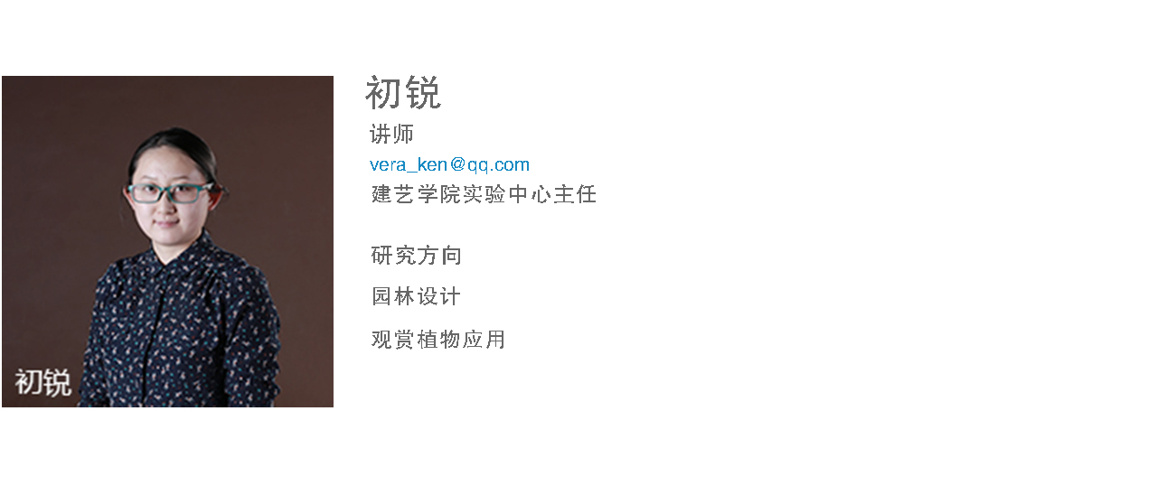 初锐讲师,硕士,东北林业大学园林专业学士、园林植物与观赏园艺专业硕士毕业。2013年8月从教于环亚(中国)HUANYA·官方网页版建筑与艺术设计学院环境设计专业,主讲《景观设计原理》、《园林植物学》、《景观设计》等课程。荣获2015年辽宁省教育软件大赛高等教育组优秀奖。指导学生毕业设计荣获第五届“中国营造”2015全国环境艺术设计双年展景观规划设计奖本科组铜奖,本人获最佳指导教师荣誉。指导省级大学生创新创业项目一项,校级两项。