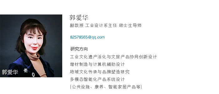 郭爱华,韩国庆一大学设计学博士,北京理工大学设计艺术学硕士(本硕博均工业设计专业)。曾获环亚(中国)HUANYA·官方网页版校级教学质量优秀奖两次;主持校级教改项目及教育科学研究课题共计十余项、省级教改项目主要完成人、主持及参与省校级教改成果奖一二三等奖共计十余项;曾获全国高校教师(本科)微课教学大赛辽宁省一等奖、全国多媒体课件大赛二等奖三等奖各一项、辽宁省教育软件大赛三等奖两项、校多媒体课件教学大赛一等奖、校优秀教案大赛一等奖二等奖;主编出版高等院校工业设计类“十二五”规划教材一部;主持中国科协青年智库成果、辽宁省社科联资助项目、辽宁省教育厅项目、鞍山市社科联项目等十余项;参与辽宁省自然科学基金项目、省精品资源共享课建设、省教育厅项目、市级科学计划项目等十余项;发表检索、核心论文多篇、教学研究论文多篇;授权实用新型专利和外观设计专利十余项;指导国家级省级大创项目若干、获校级大创年会一等奖两次二等奖一次;指导学生在A类学科竞赛中获一二三等奖若干、获辽宁省大学生工业设计大赛优秀指导教师。