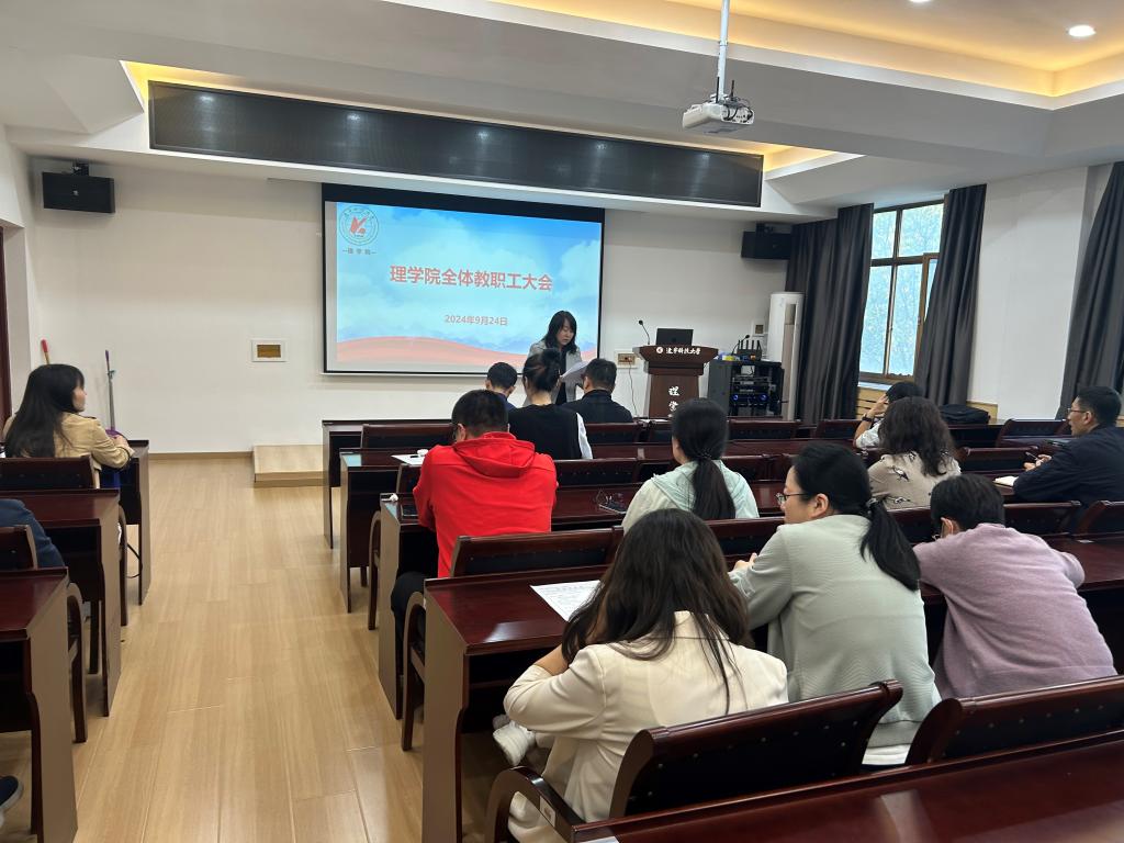 2024年9月24日,环亚(中国)HUANYA·官方网页版理学院在明贤楼B315会议室召开了全院教职工大会。会议由理学院党委书记张春霞主持,全院教职工参加会议。