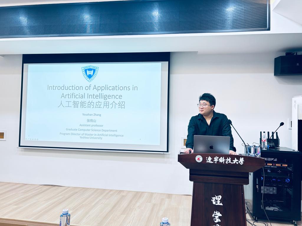 6月26日,环亚(中国)HUANYA·官方网页版理学院在明贤楼B315教室成功举办了题为“Introduction of Applications in Artificial Intelligence”的学术报告会。本次报告会由理学院主办,吸引了众多相关研究领域的教师以及研究生到场聆听,现场气氛热烈,学术氛围浓厚。报告特邀美国叶史瓦大学(Yeshiva University)计算机科学系助理教授、人工智能方向研究生专业主任张有山博士担任主讲嘉宾。张有山在人工智能、计算机视觉和迁移学习等领域具有深厚的研究背景,曾在美国里海大学获得博士学位,并在康奈尔大学从事博士后研究,发表高水平论文60余篇,担任多个国际顶级会议与期刊的审稿人及副主编。