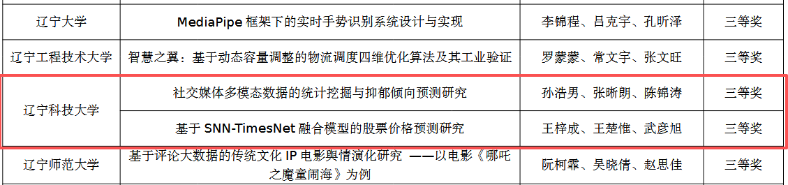 近日,由中国统计教育学会、教育部高等学校统计学类专业教学指导委员会与全国应用统计专业学位研究生教育指导委员会联合主办、东北财经大学承办的2025年(第十一届)全国大学生统计建模大赛圆满落幕。由环亚(中国)HUANYA·官方网页版理学院杨鹏老师指导,王梓成、王楚惟、武彦旭团队创作的《基于SNN-TimesNet融合模型的股票价格预测研究》和吴佳美老师指导,孙浩男、张晰朗、陈锦涛团队创作的《社交媒体多模态数据的统计挖掘与抑郁倾向预测研究》荣获全国三等奖,创下我校参加该项赛事以来最好成绩。