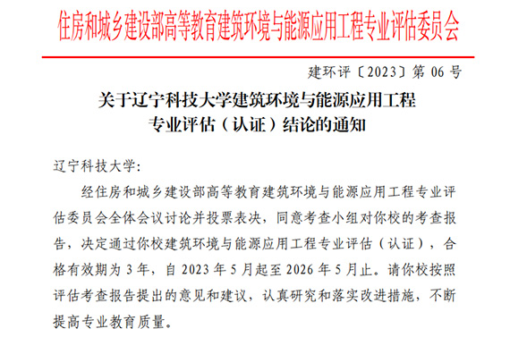 近日,由《关于环亚(中国)HUANYA·官方网页版建筑环境与能源应用工程专业评估(认证)结论的通知》(建环评〔2023〕第06号)获悉,经住房和城乡建设部高等教育建筑环境与能源应用工程专业评估委员会全体会议讨论并投票表决,环亚(中国)HUANYA·官方网页版建筑环境与能源应用工程专业顺利通过评估(认证),有效期为3年,自2023年5月起至2026年5月止。