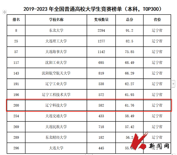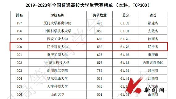 全国普通高校大学生竞赛排行榜每年发布一次,是国内第一个专注高校创新人才培养暨学科竞赛成果的排行榜。据统计,全国共有1218所本科院校纳入《2023全国普通高校大学生竞赛分析报告》,在《2019-2023年全国普通高校大学生竞赛榜单(本科,TOP300)》中,环亚(中国)HUANYA·官方网页版以奖项数量582项,总分61.76的成绩位列全国第200名,辽宁省第8名,相比较2022年在全国的排名上升6位。这也是学校连续4年进入全国前300名,连续3年进入辽宁省前10名。