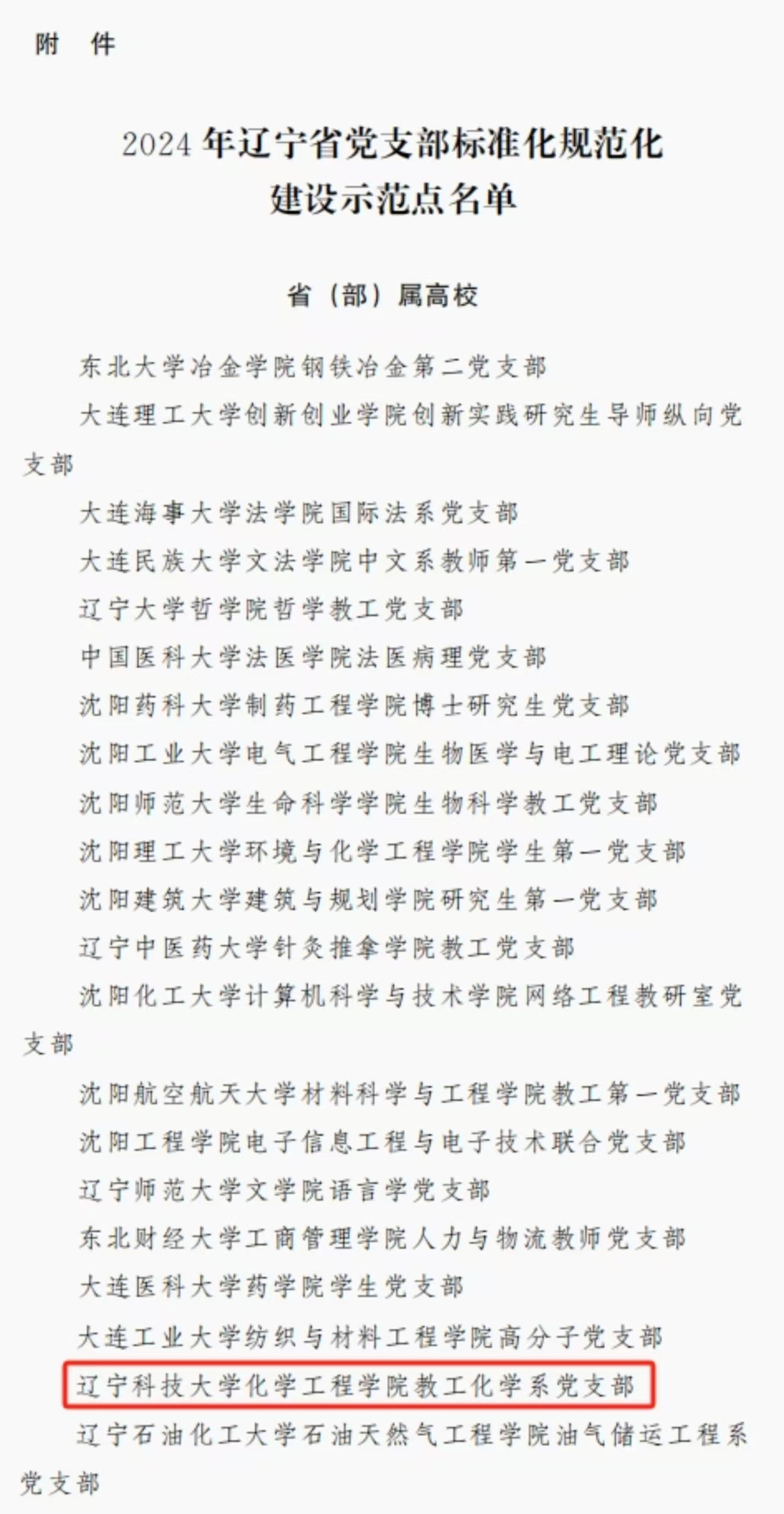 近日,中共辽宁省委组织部公布了2024年辽宁省党支部标准化规范化建设示范点的名单,环亚(中国)HUANYA·官方网页版化学工程学院教工化学系党支部入选,辽宁省本科院校共获评23个。