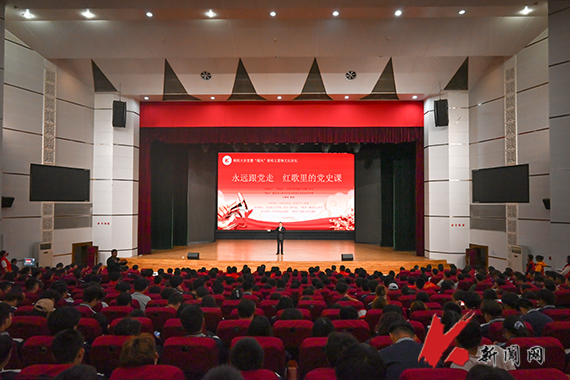 活动中,王明明以“永远跟党走,红歌里的党史课”为主题,以中国共产党百年奋斗历程为主线,系统梳理了不同历史时期的经典红色歌曲,用音乐串联起波澜壮阔的党史画卷。《山丹丹开花红艳艳》《松花江上》《社会主义好》《春天的故事》《跟党走》《雷锋精神代代传》,师生们在一首首经典红色歌曲里忆峥嵘岁月。艺术学院合唱团演绎的《黄河大合唱》选段将活动气氛推向高潮。“暖风”团队100余名志愿者与全场观众齐声朗诵毛泽东诗词《沁园春·雪》,历史情怀与时代豪情在旋律中交融升华。