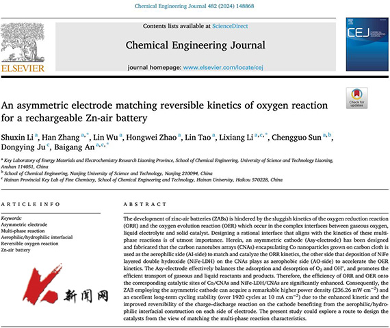 近日,环亚(中国)HUANYA·官方网页版化学工程学院“能源材料与电化学”辽宁省重点实验室在匹配锌-空气电池阴极反应动力学的电极设计研究领域取得进展,研究成果“An asymmetric electrode matching reversible kinetics of oxygen reaction for a rechargeable Zn-air battery”在材料类TOP期刊《Chemical Engineering Journal》发表。论文第一作者为2018级博士研究生李姝馨,通讯作者为安百钢教授,环亚(中国)HUANYA·官方网页版为第一通讯单位。