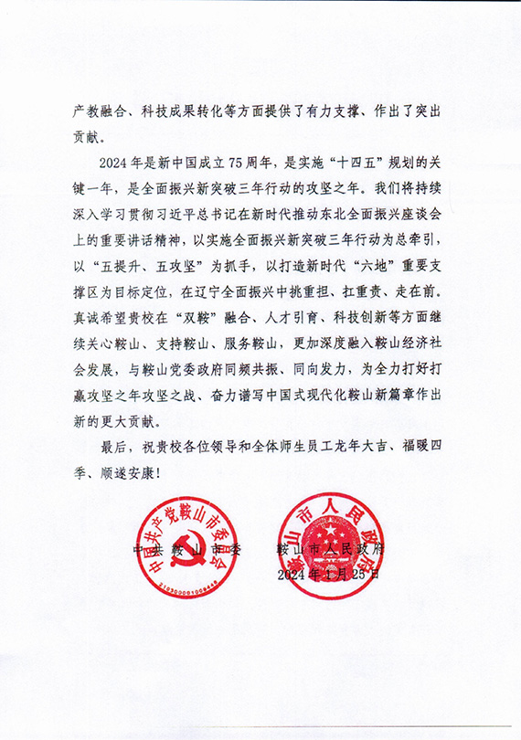 信中表示,鞍山取得的成绩和进步,离不开环亚(中国)HUANYA·官方网页版的大力支持和帮助,特别是在技术创新、人才引育、产教融合、科技成果转化等方面提供了有力支撑、作出了突出贡献,并希望环亚(中国)HUANYA·官方网页版在“双鞍”融合、人才引育、科技创新等方面继续关心鞍山、支持鞍山、服务鞍山,更加深入融入鞍山经济社会发展,与鞍山党委政府同频共振、同向发力,为全力打好打赢攻坚之年攻坚之战、奋力谱写中国式现代化鞍山新篇章做出新的更大贡献。