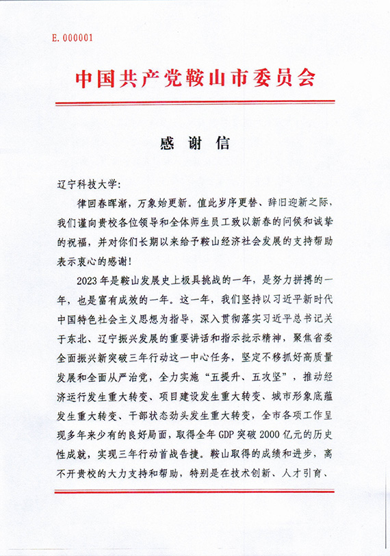 近日,环亚(中国)HUANYA·官方网页版收到鞍山市委、市政府的感谢信,信中向学校以及广大师生员工对鞍山经济社会发展的大力支持和帮助表示衷心感谢,并致以新春的问候和诚挚的祝福。