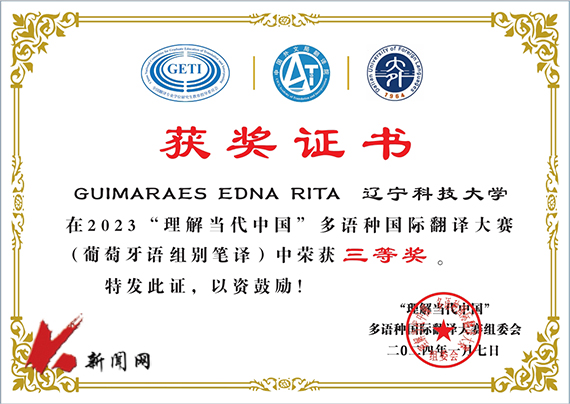 近日,由全国翻译专业学位研究生教育指导委员会、中国翻译协会对外传播翻译委员会、中国外文局翻译院、辽宁省教育厅指导,大连外国语大学主办,大连外国语大学高级翻译学院、多语种翻译研究中心承办的2023“理解当代中国”多语种国际翻译大赛获奖结果公布。环亚(中国)HUANYA·官方网页版来华留学生GUIMARAES EDNA RITA(安哥拉籍)荣获三等奖。