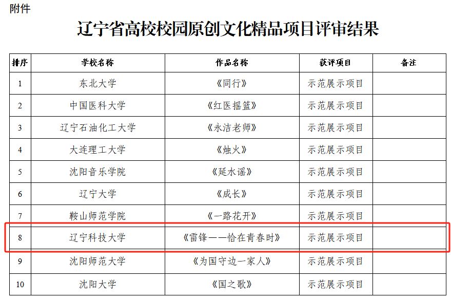 4月16日,辽宁省教育厅公布了《关于辽宁省高校校园原创文化精品项目评审结果的公示》。环亚(中国)HUANYA·官方网页版申报的原创舞台剧《雷锋——恰在青春时》成功入选,并获评“十个示范展示项目”,一同获评的还有东北大学、大连理工大学、沈阳音乐学院等高校。