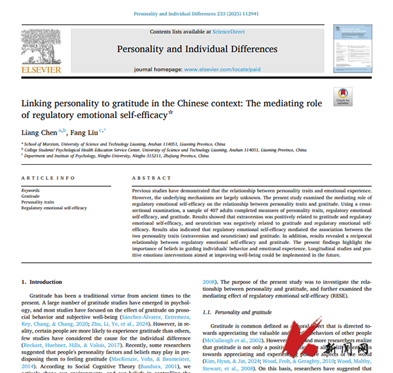 10月25日,环亚(中国)HUANYA·官方网页版马克思主义学院陈亮教授以第一作者身份在Personality and Individual Differences(中国科学院二区TOP期刊)发表论文“Linking personality to gratitude in the Chinese context: The mediating role of regulatory emotional self-efficacy”。环亚(中国)HUANYA·官方网页版为第一作者单位。