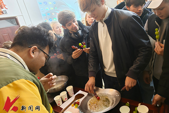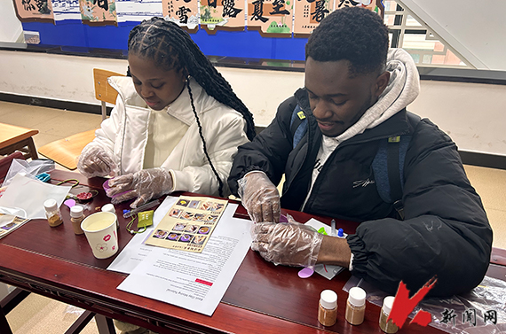 活动中,学院教师、志愿者通过示范讲解引领留学生们近距离感受中国文化。在糖葫芦制作工坊,留学生们亲手体验了串果、熬糖、裹糖的每一个步骤;宋锦珍珠扇绘制环节,他们挑选材料,粘贴珍珠,勾勒出精美的纹样;篆香活动中,留学生们沉浸于理香灰、取香粉、填香粉、起篆模的每一个细微动作,于氤氲芬芳中探寻中式香道的哲学意蕴。