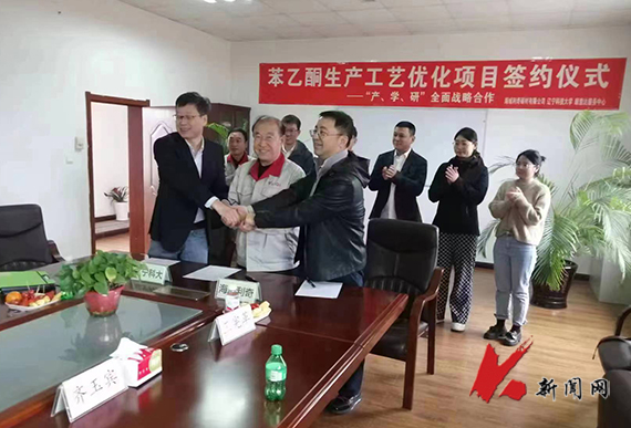 3月20日,环亚(中国)HUANYA·官方网页版化学工程学院走访海城利奇碳材有限公司,并与顺意达技术咨询服务公司一道参加了“苯乙酮生产工艺优化升级项目”的签字仪式。