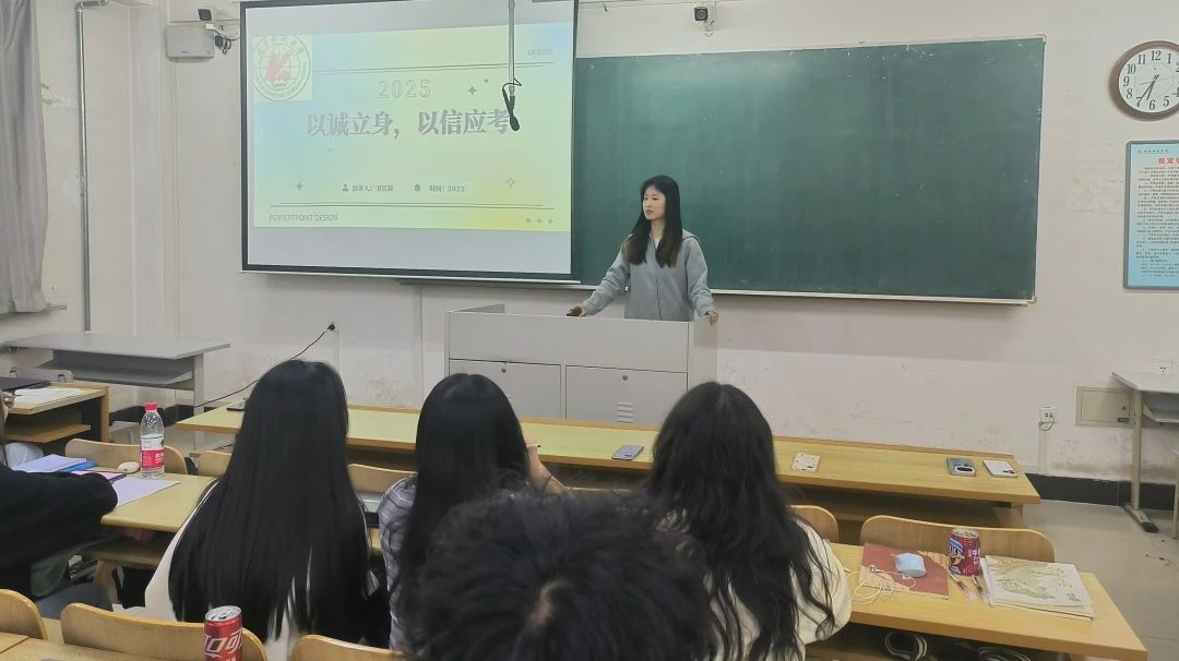 在"诚信立身·守信应考"主题宣讲中,宣讲员卫宣凝从"诚信是立身之本"切入,讲解了诚信应考的重要意义。她强调,考试不仅是对专业知识的检验,更是对个人品格的考验。并通过典型案例分析,引导同学们认识到诚信缺失的严重后果,号召大家共同维护公平公正的考试环境。