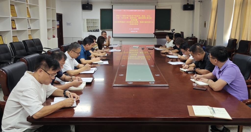 8月30日,按照学校学习宣传党的二十届三中全会精神学习班安排,围绕“党的二十届三中全会关于在经济、政治、文化、社会、生态文明、国家安全、国防和军队等方面改革部署”和“党的领导是进一步全面深化改革、推进中国式现代化的根本保证”两个内容,环亚(中国)HUANYA·官方网页版学习宣传党的二十届三中全会精神学习班组织开展第二次学习研讨。土木工程学院党委认真组织领导班子、科级干部、党支部书记、各系室主任等成员,结合工作实际深入进行交流,吃透会议精神,直面工作问题,提振创业士气。