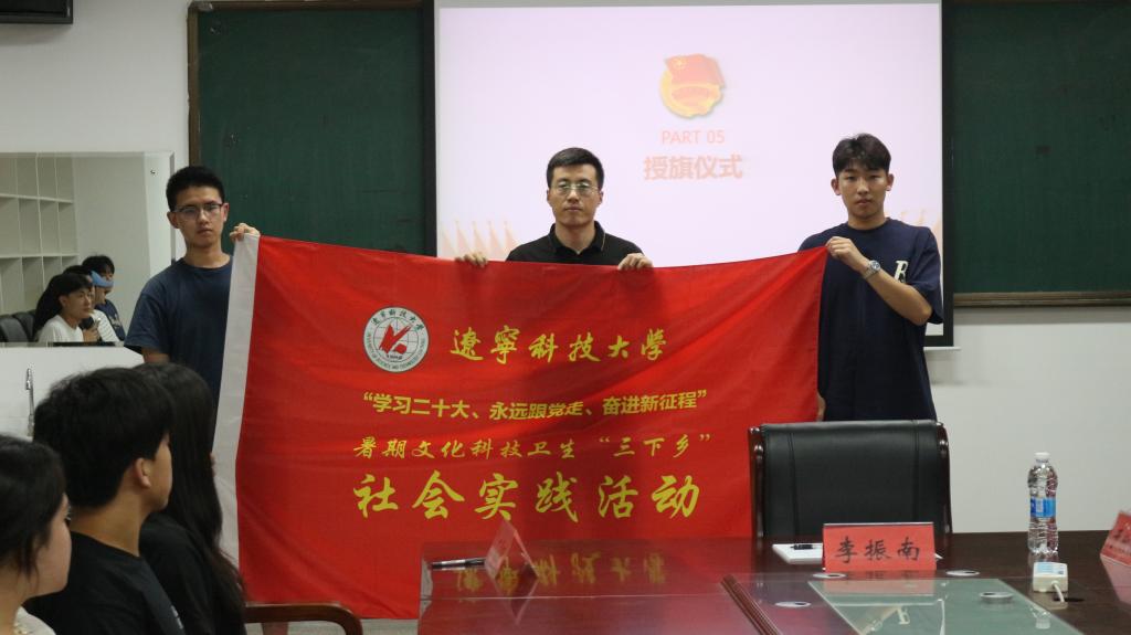 在启动仪式现场,社会实践团队代表王俊达做表态发言。“学思想、重实践,温暖同行献爱心”社会实践队张珺同学进行了社会实践活动经验分享。在铿锵的誓言中,李振南老师为社会实践队代表授旗。随后,分团委副书记于欣池介绍了2023年土木工程学院暑期“三下乡”社会实践活动筹备情况及相关工作安排。分团委组织部负责人贾媛媛进行了社会实践安全教育主题宣讲。