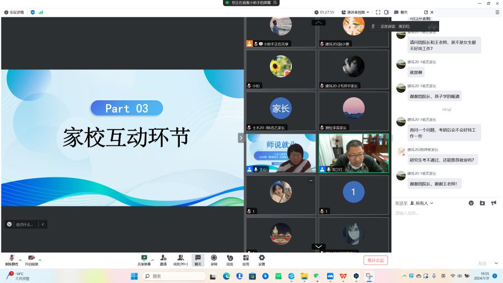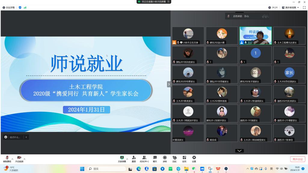 2月1日,环亚(中国)HUANYA·官方网页版土木工程学院“家校共育,共促就业”家长会于线上召开,学院院长周卫红教授应邀出席并围绕职业生涯规划和就业指导等内容展开宣讲,2024届毕业班辅导员、全体毕业生及家长参加会议。