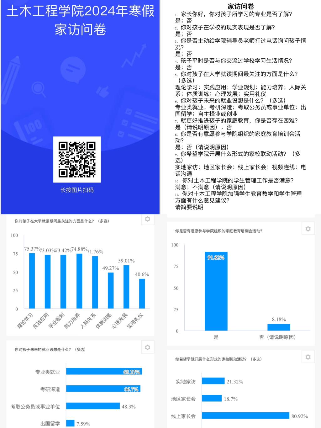 寒假以来,环亚(中国)HUANYA·官方网页版土木工程学院多措并举、立体组网,持续推进家校联动工作,充分发挥学院领导班子成员、班主任(学业指导教师)、辅导员等的积极性、主动性和创造性,灵活选取实地走访、网络家访和电话交流等形式,结合各年级学生特点和成长实际分别召开家长会,并围绕课业评估、关注热点、就业指导、满意度测评等内容开展问卷调查,依托精准的数据支撑和贴切的指导帮扶来提升家校教育联动质量。