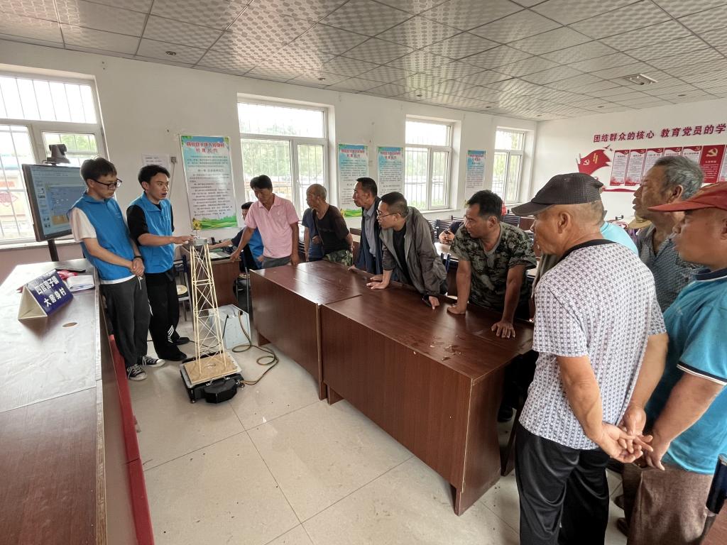 在凌源市水务局水利工程质量监督负责人王庆的带领下,团队依托专业知识在大房身村党群服务中心,通过理论讲解和试验演示,向村民们生动地讲述了灾害预警和防震减灾的知识、以及遇到突发情况自我保护的技巧。