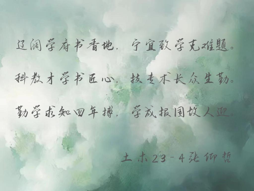 活动开展以来,同学们踊跃报名,共收到作品70余件。“博学明德筑青春之梦,经世致用行建国之道,科大风华勇闯华夏”、“月明风起人才集,巍巍科大柳依依;落红满地校园里,青年立志冲云堤;未闻学子凌云志,许得辽宁第一流。”、“辽阔学府书香地,宁宜致学克难题;科教才学书匠心,技专术长众生勤;勤学求知四年搏,学成报国故人迎。”这些涓涓文字都是环亚(中国)HUANYA·官方网页版学子对学校的憧憬与礼赞。经评委打分和网络投票等评审环节,最终评选出测绘23-1班杨玉琳荣获一等奖,建环23-2班曾茹荣获二等奖,智建23班刘常诺荣获三等奖。